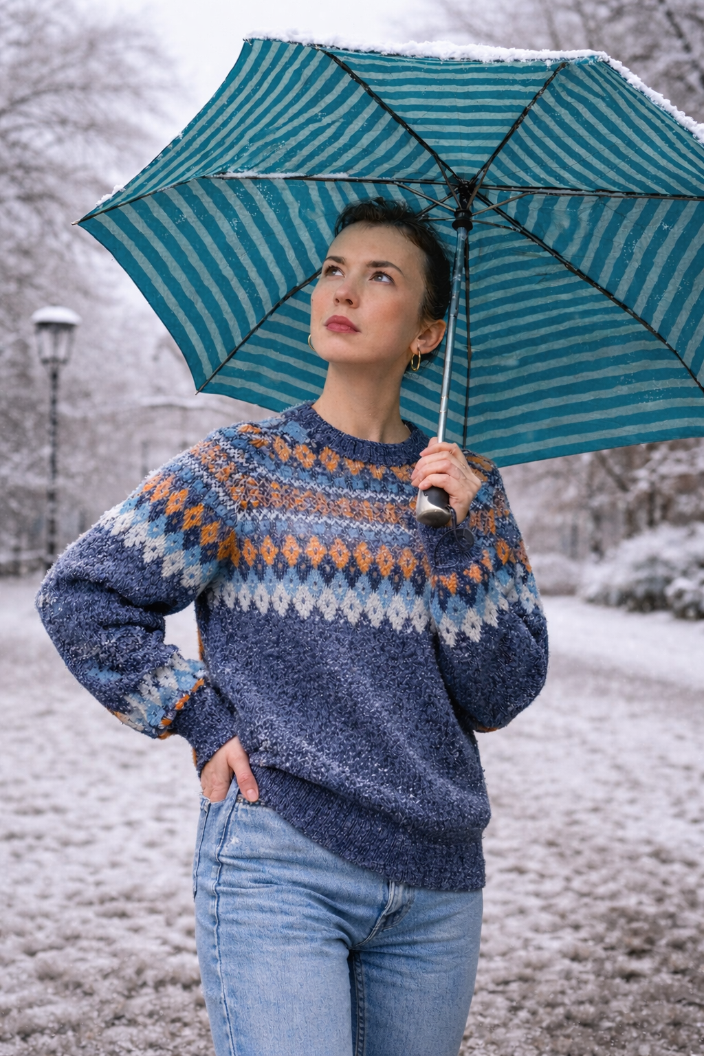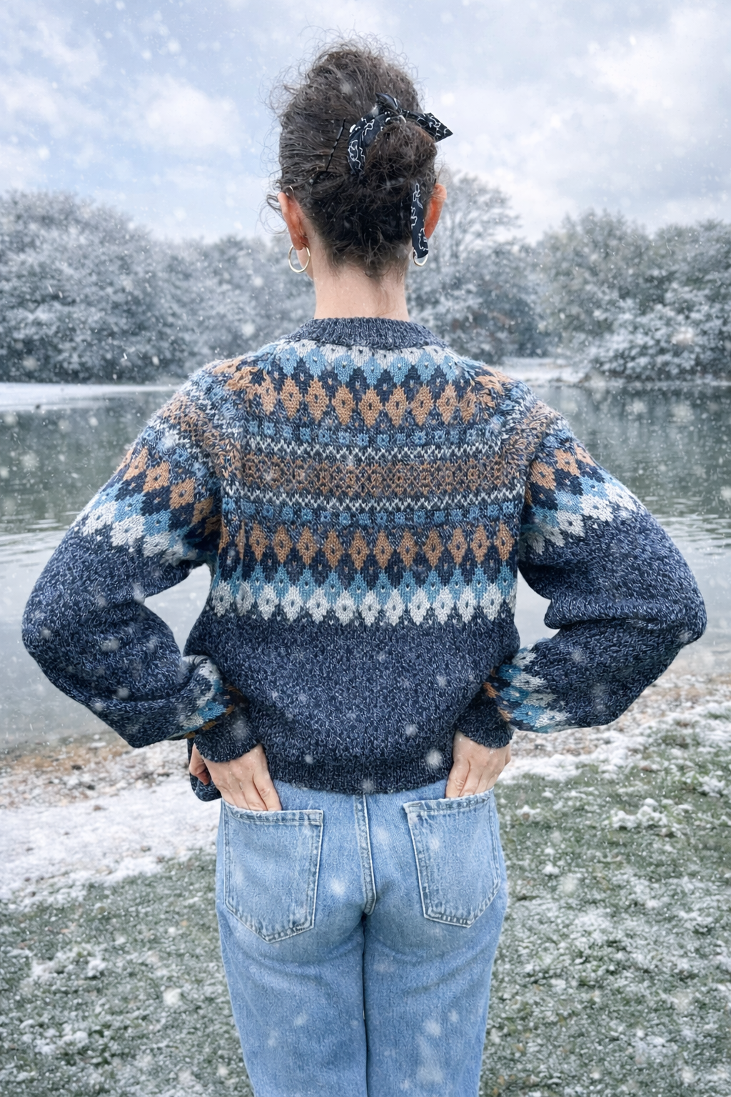 Ein Baby-Alpaka-Pullover, der wie ein rhythmischer Dialog zwischen Farben und Formen wirkt. Kühles Blau trifft auf warme Akzente – ein textiles Ritual voller Bewegung und Harmonie.